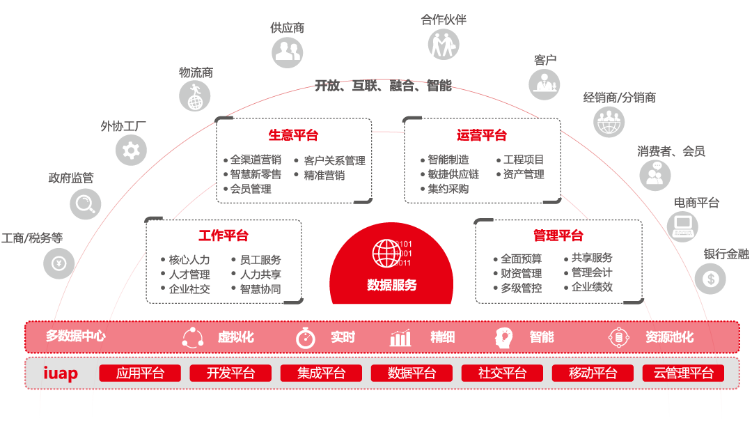 用友NC Cloud基于iuap社会化商业应用基础平台,围绕人、财、物、客四大管控对象,帮助企业构建面向社会化商业的工作平台、管理平台、运营平台和生意平台,连接全球、全网、全域资源,赋能企业实现基于技术驱动的业务变革和商业创新。