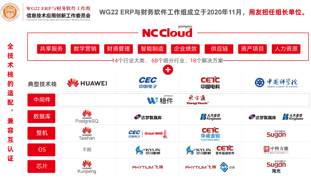 为了推动信创产业发展,用友参与了信创联盟、信创工委会、WG22 ERP与财务软件工作组等组织机构。用友NC Cloud与华为鲲鹏体系和中国电子PKS体系等国内主流的信创产品进行全栈适配。截止2021年5月,用友NC Cloud已与近50个国产化产品实现兼容认证,形成安全可信的数智化解决方案。