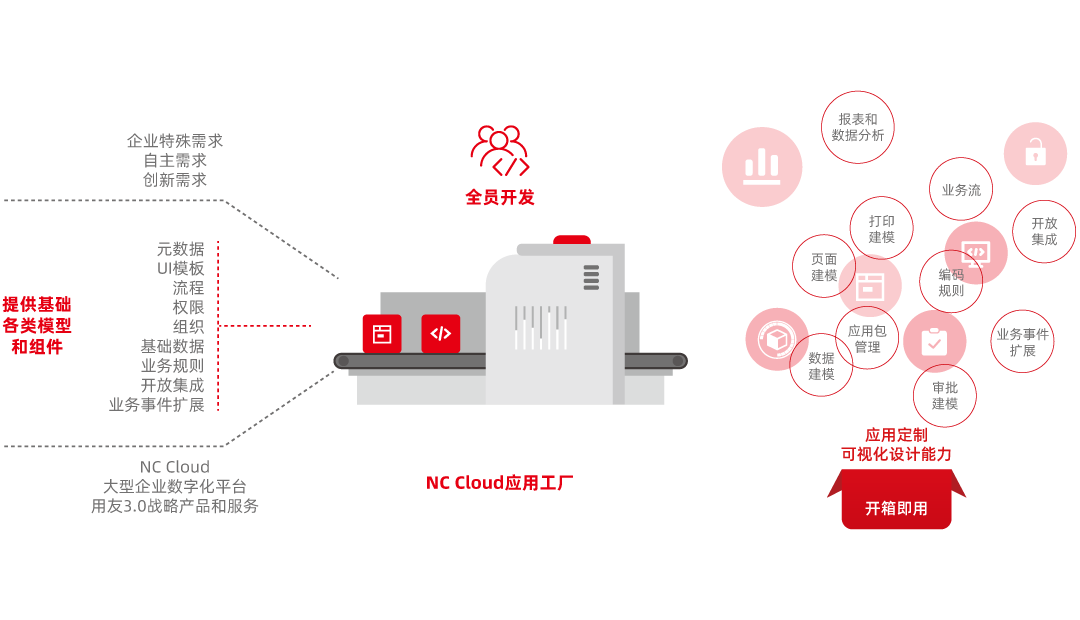用友NC Cloud应用工厂作为零代码开发平台,为企业提供了各类基础模型和组件(如元数据、UI模板、流程、权限、组织、基础数据、业务规则、开放集成、业务事件扩展等),支持全员开发,真正开箱即用,基于个性化定制开发的模式,满足企业在数智化时代的自主创新需求。