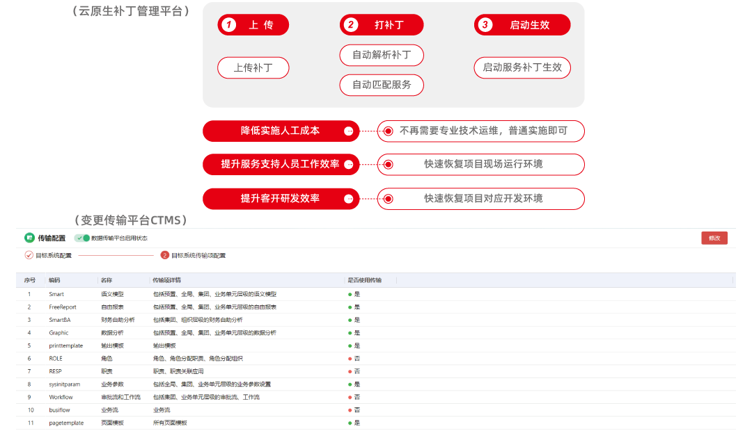 用友NC Cloud提供了可助力企业在云模式下高效运维的B类工具,通过变更传输平台CTMS、云原生补丁管理平台,保证业务系统的连续、可靠、一致性,同时缩短项目工期,提升实施、服务、客开等支持人员的交付效率 。
